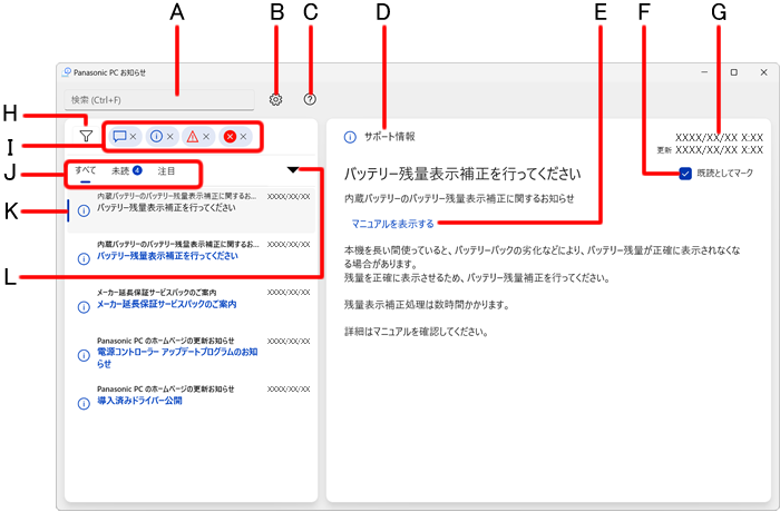 Panasonic PC お知らせは、本機を快適にご使用いただくために、次のような通知を取得するアプリケーションです。