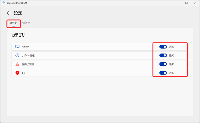 通知のオン/オフを切り替えるカテゴリのスイッチをクリックしてください。