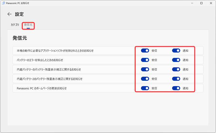 受信、および通知のオン/オフを切り替える発信元の各スイッチをクリックしてください。
