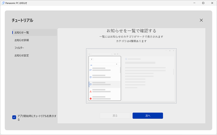 ※「アプリ開始時にチュートリアルを表示する」をクリックしてチェックマークを外すと、Panasonic PC お知らせの起動時に表示されません。