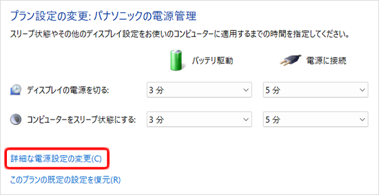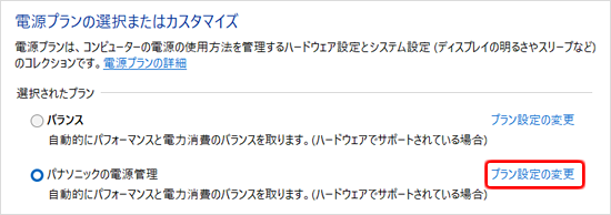 使用している電源プランの[プラン設定の変更]をクリックする。