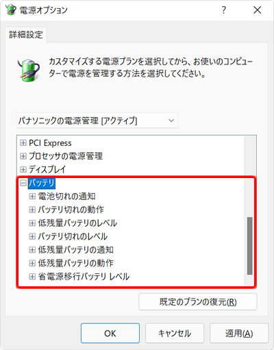 低残量バッテリのレベル/バッテリ切れのレベルの設定は電源プランごとに設定できます。