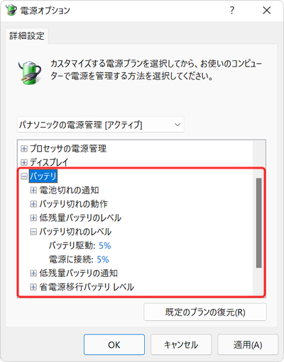 [バッテリ切れのレベル]は5%以上に設定してください。設定値が小さいと、バッテリー残量が少なくなったときにスリープ状態や休止状態の機能が正常に働かなくなります。