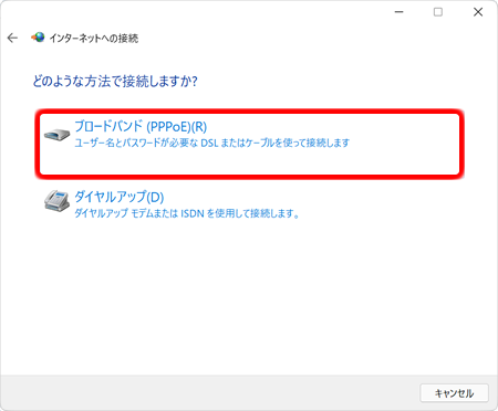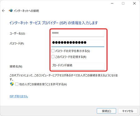 プロバイダーや回線業者から提供された説明書に従って、必要な項目を入力し[接続]をクリックする。