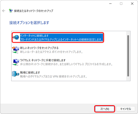 [インターネットに接続します]をクリックし、[次へ]をクリックする。