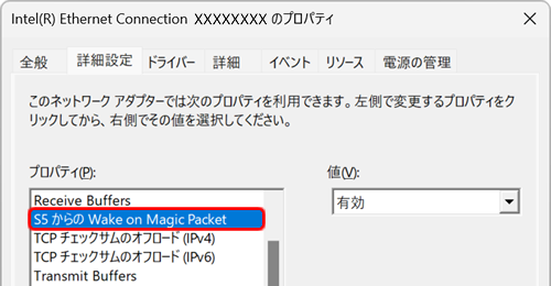 「プロパティ」の[S5 からの Wake on Magic Packet]をクリックする。