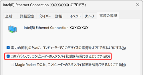 [このデバイスで、コンピューターのスタンバイ状態を解除できるようにする]をクリックしてチェックマークを付ける、またはチェックマークを外す。