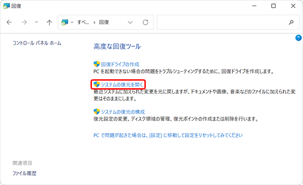 Windowsに問題が発生する前の状態にシステムを復元します。ただし、「回復」でシステムの復元を行った場合は、プログラムやドライバー、データを削除することがあります。問題が発生した場合や「回復」の詳しい操作方法は、