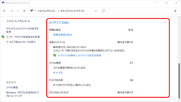 「セキュリティとメンテナンス」で[メンテナンス]をクリックすると、メンテナンスに関する項目が表示され、パソコンをより快適にお使いいただくために用意されているWindowsのメンテナンス機能を、確認/設定できます。
