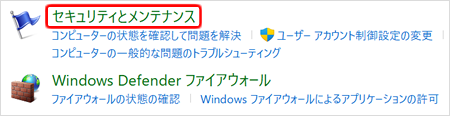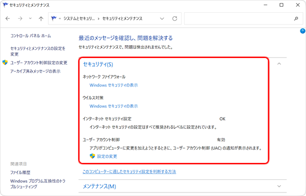 「セキュリティとメンテナンス」で[セキュリティ]をクリックすると、セキュリティに関連する項目が表示され、それぞれの状態と設定を確認/変更できます。