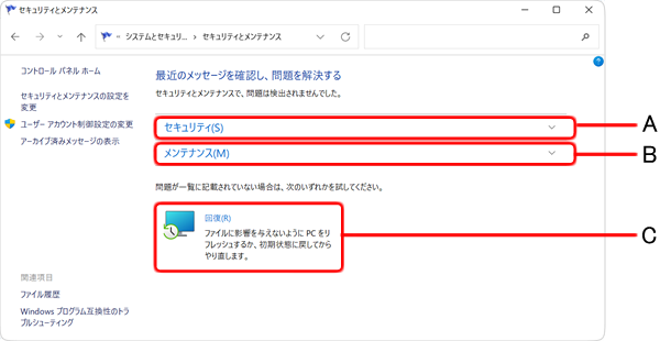 「セキュリティとメンテナンス」が開きます。セキュリティとメンテナンスの設定において、安全な設定になっていないなど、確認が必要な項目のみ警告メッセージを表示します。