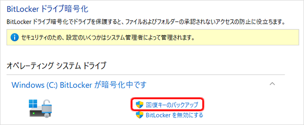 [回復キーのバックアップ]をクリックする。