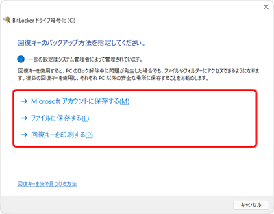 BitLocker を有効にした場合は回復キーを保存する画面が表示されます。表示された画面の内容に従って回復キーを保存、または印刷します。