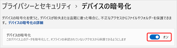 また、ユーザーアカウントをMicrosoft アカウントにしたときは、「デバイスの暗号化」(BitLocker ドライブ暗号化)がオンになり、自動的にフラッシュメモリードライブが暗号化されます。