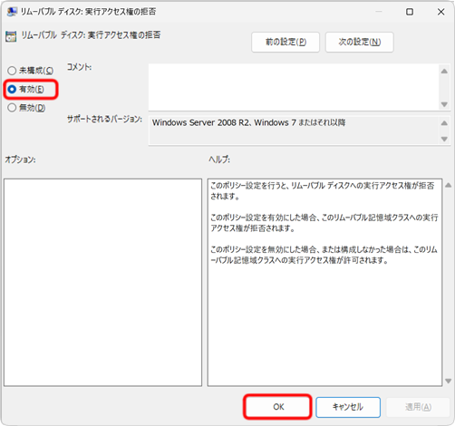 制限を解除したい場合は、[無効]をクリックしてください。 -