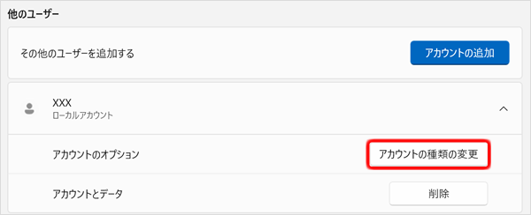 アカウントの種類を変更するユーザーをクリックして、[アカウントの種類の変更]をクリックする。