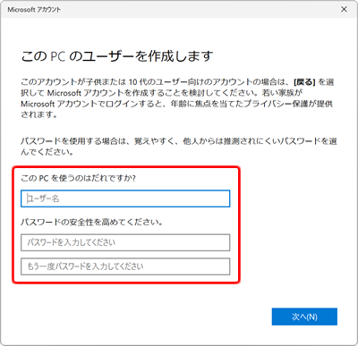 ここで入力したパスワードは、サインイン オプションのパスワードになります。作成したユーザーアカウントでサインインするときに必要になります。