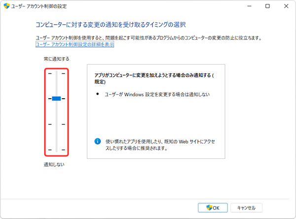 スライドバーを上下に動かし、どのような場合に「ユーザーアカウント制御」画面を表示するかを設定し、[OK]をクリックする。