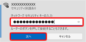 ネットワーク セキュリティ キーを入力して[次へ]をクリックする。