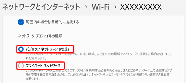 「ネットワーク プロファイルの種類」の[パブリック ネットワーク (推奨)]、または[プライベート ネットワーク]をクリックする。