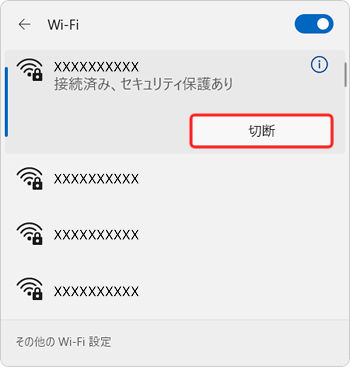 接続している無線LANアクセスポイントの[切断]をクリックする。