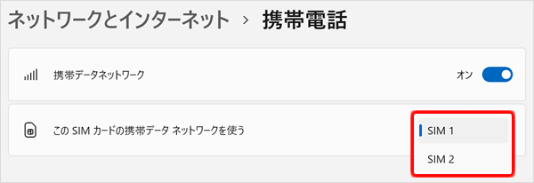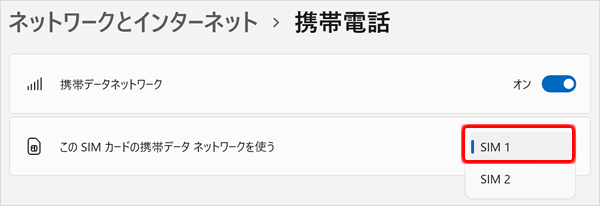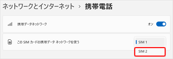 「この SIM カードの携帯データ ネットワークを使う」のメニューをクリックして、使用するSIMを選択します。
