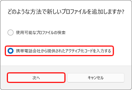 [携帯電話会社から提供されたアクティブ化コードを入力する]を選択し、[次へ]をクリックする。