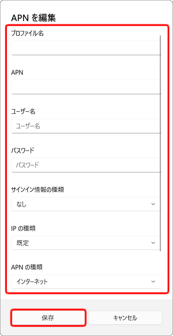 ご契約の通信事業者が提供するインターネット接続情報を「APNを編集」に入力して、[保存]をクリックする。