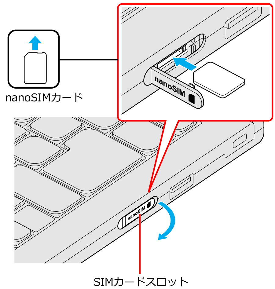 ワイヤレスWAN搭載モデルには、nanoSIMカードスロットの位置に「nanoSIMカードラベル」が貼り付けられています。お使いの機種がワイヤレスWAN搭載モデルであることを確認するには、「nanoSIMカードラベル」を確認してください。nanoSIMカードスロットの場所は「nanoSIMカードをセットする」をご覧ください。